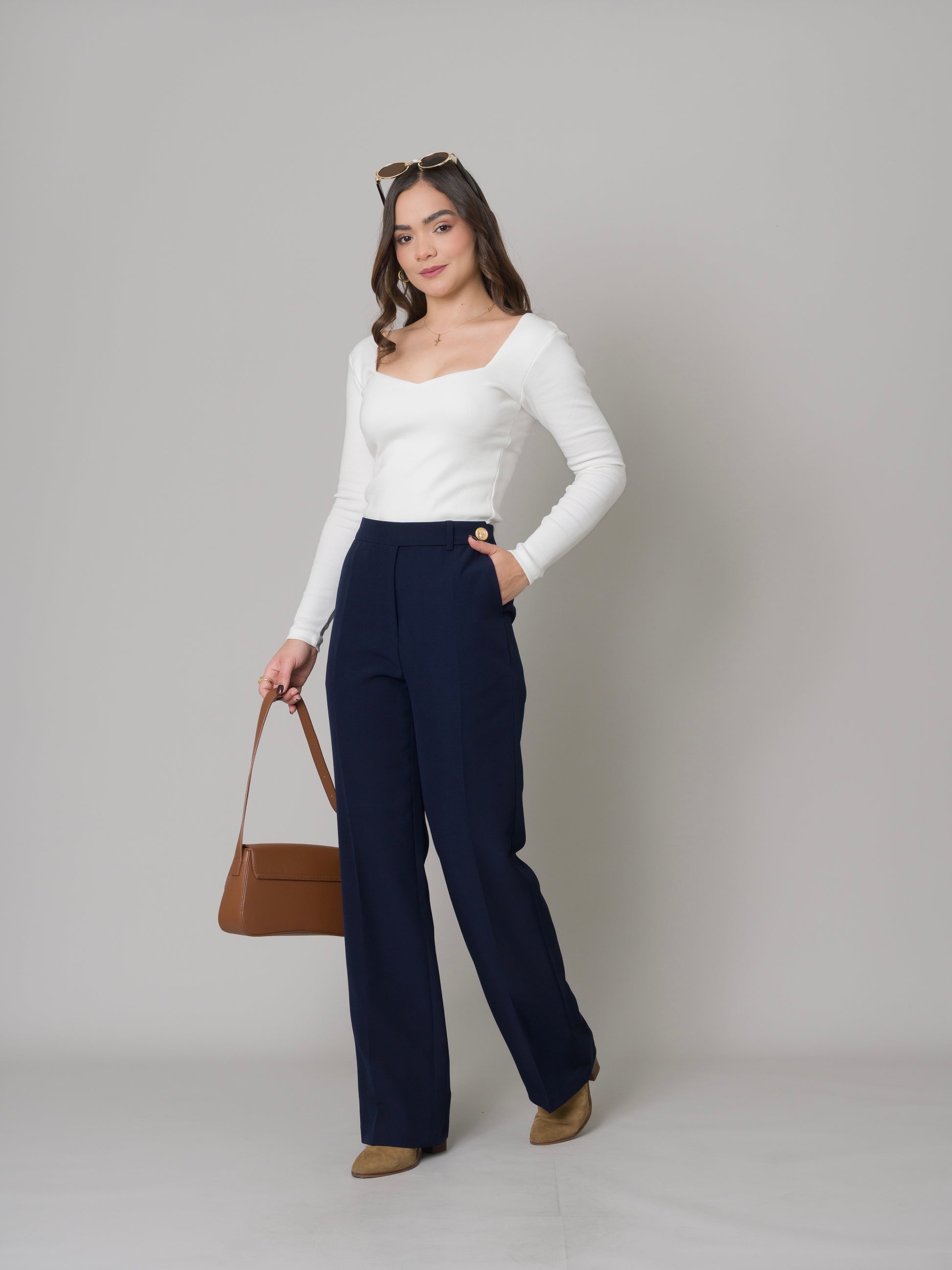 Nuestro pantalón Mayra tiene el corte recto, tiro alto y además un botón dorado en la pretina que realza la prenda, pídelo en el color que mas te guste y elige la versión ideal para ti PETIT o REGULAR.