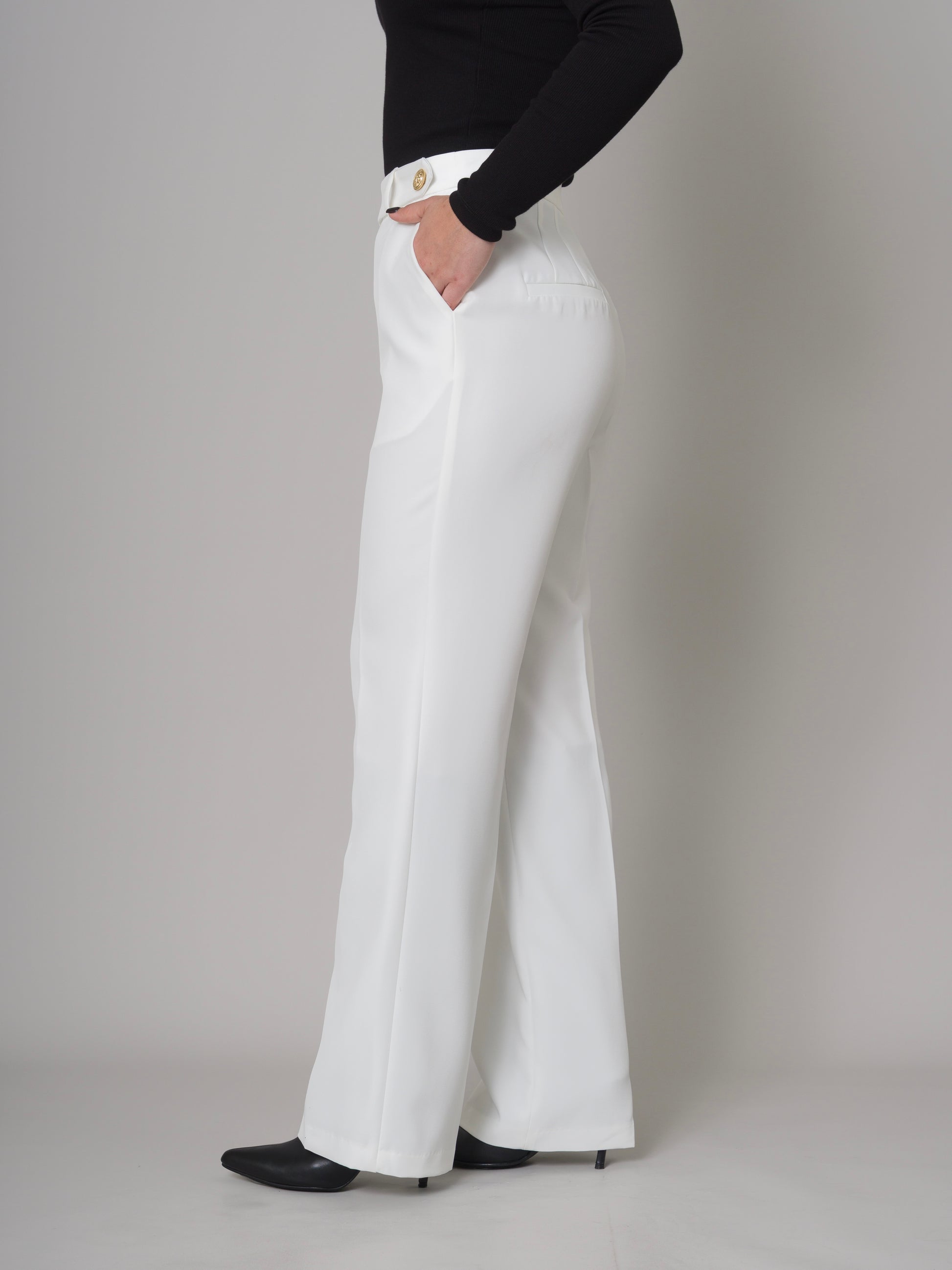 Nuestro pantalón Mayra tiene el corte recto, tiro alto y además un botón dorado en la pretina que realza la prenda, pídelo en el color que mas te guste y elige la versión ideal para ti PETIT o REGULAR.